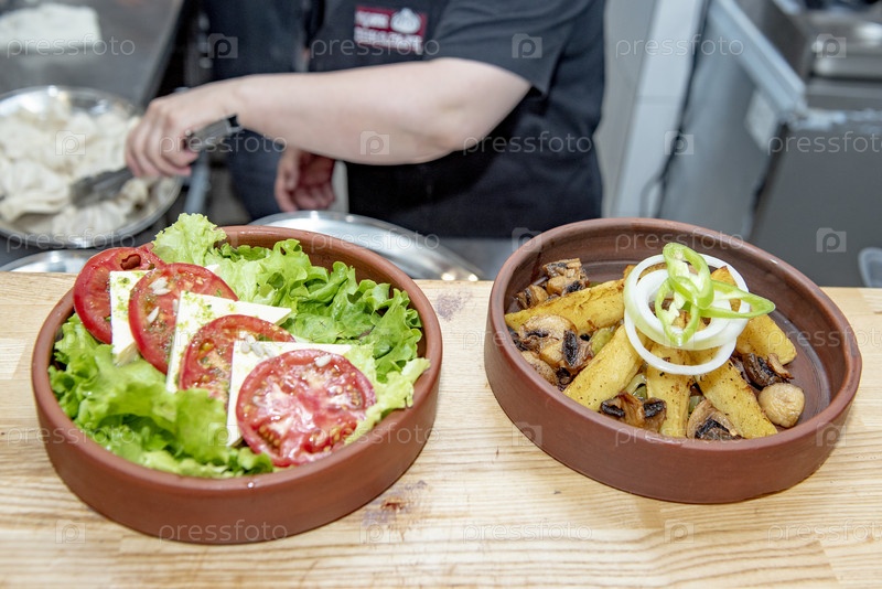 Салаты на тарелках в ресторане