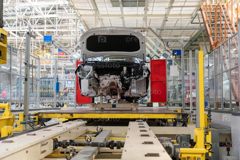Современная высокотехнологичная автомобильная сборочная линия с шасси белого кузова автомобиля, установленного на желтой конвейерной системе в промышленной производственной среде во время процесса производства