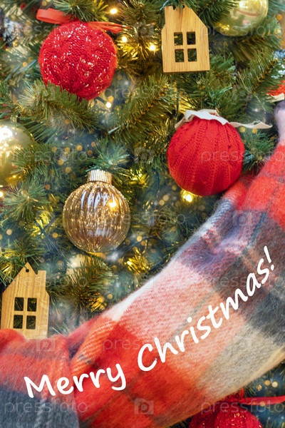 Рождественская елка с вязаными шарами и деревянными украшениями в виде домов связана теплым чековым шарфом с праздничным сообщением 'Счастливого Рождества'