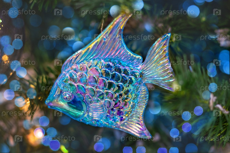 Близкий план блестящего орнамента рыбы из радужного стекла, висящего на рождественской елке с зелеными ветвями и подводными пузырьковыми огнями