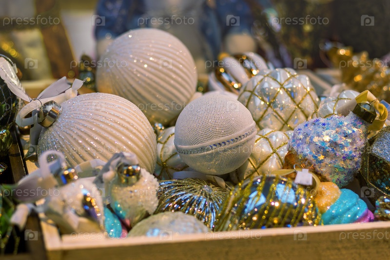 Коллекция блестящих рождественских украшений, включая шары различных цветов и узоров в белых и синих тонах