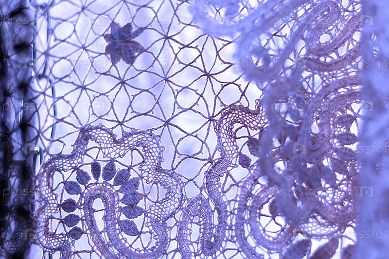 Детальное изображение, захватывающее сложное ремесленное мастерство кружевного узора с цветочным дизайном в оттенках фиолетового