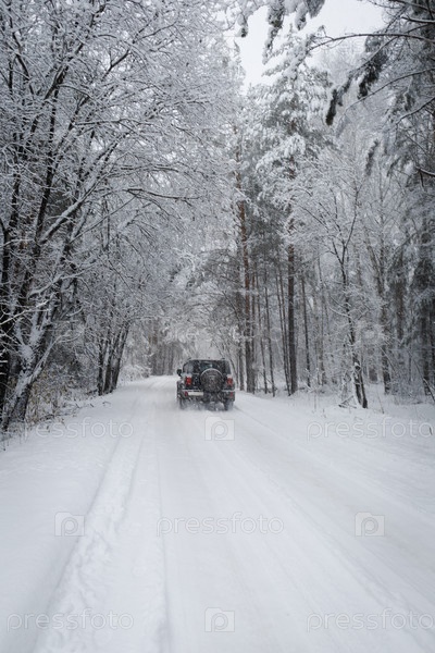 Автомобиль на дороге в зимнем лесу