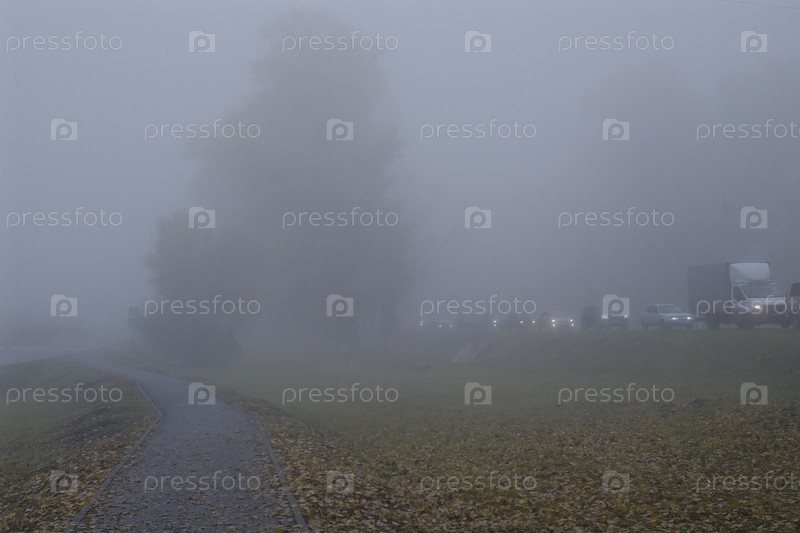 Туман на дороге представляет дополнительную опасность для водителей.Движение по общественным дорогам в условиях сниженной видимости.Россия, Воронежская область, 23 октября 2025