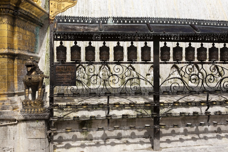 Тибетские молитвенные колеса из металла в храме Сваямбунатха, Катманду, Непал