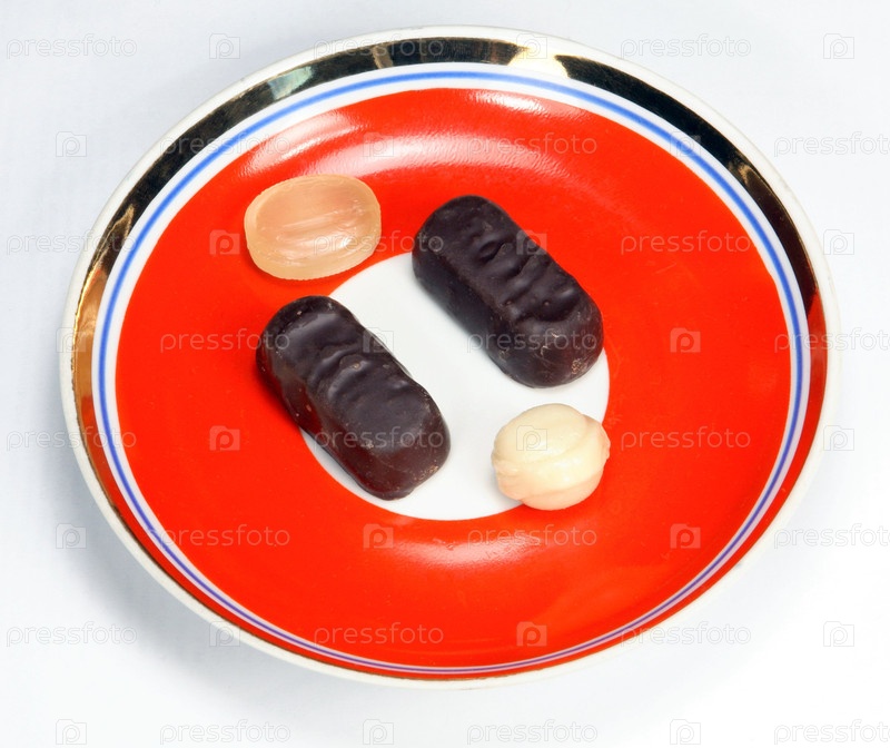 Карамель и шоколад на красной тарелке
