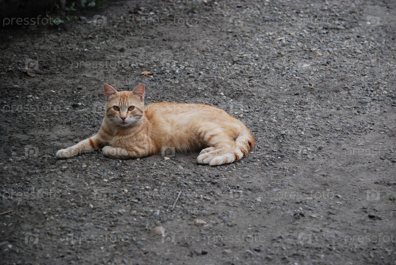Красная деревенская кошка посреди двора,