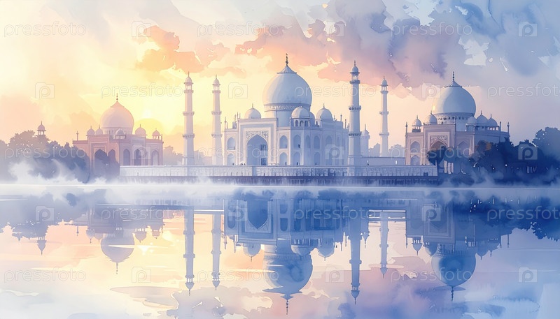 Акварельная живопись Тадж-Махала на рассвете отражается в спокойной воде, символизирующей любовь, вечность и культурное наследие, идеально подходит для путешествий, истории или романтических тем