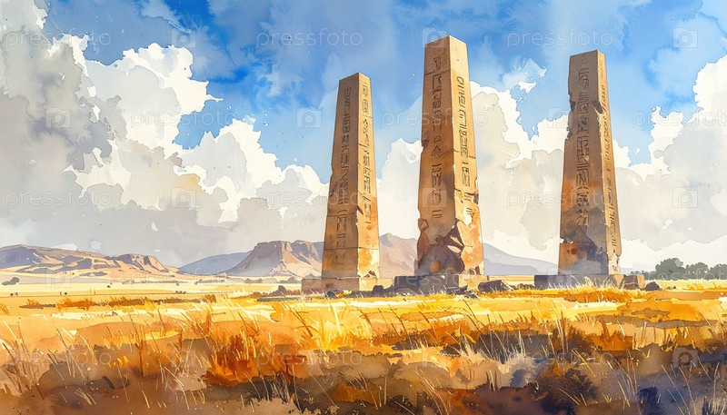 Древние каменные обелиски, стоящие в золотистом пустынном пейзаже под широким голубым небом, символизируют историю, наследие и вечные памятники древних цивилизаций