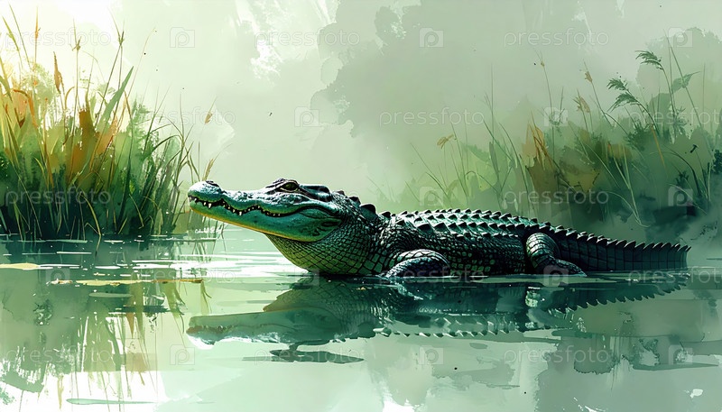 Крокодил отдыхает в спокойной зеленой воде среди тростника под естественным светом, символизируя силу, терпение и силы дикой природы в экосистеме тропических водно-болотных угодий