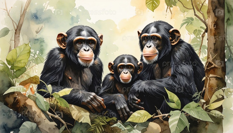 Семья из трех шимпанзе, отдыхающих вместе на ветке дерева, выражает связь, интеллект и единство дикой природы в концепции сохранения