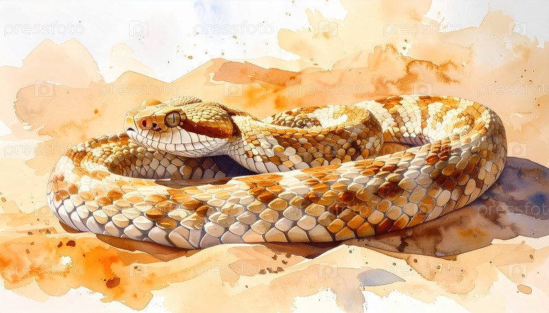 Скрученная змея с рисунковыми чешуями в пустынном песке символизирует бдительность, опасность и инстинкт выживания в дикой природе, представляя точность и красоту природы