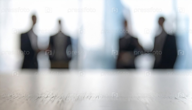 Размытый фон деловых встреч показывает силуэты людей в дискуссии, представляющие корпоративную командную работу, переговоры и лидерство в современной офисной обстановке