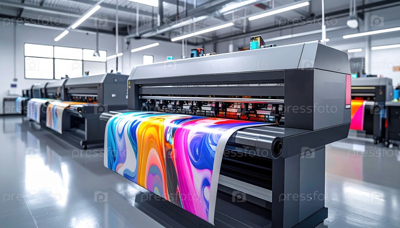 Промышленные печатные машины, производящие красочные листы на современном объекте, символизируют технологии, творчество и тенденции цифрового производства в современной индустрии дизайна