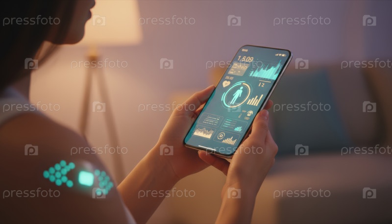 Женщина проверяет данные о здоровье на своем смартфоне с биометрическими датчиками, светящимися на ее руке, что представляет собой слияние технологий, личного здоровья и тренда благополучия, основанного на данных