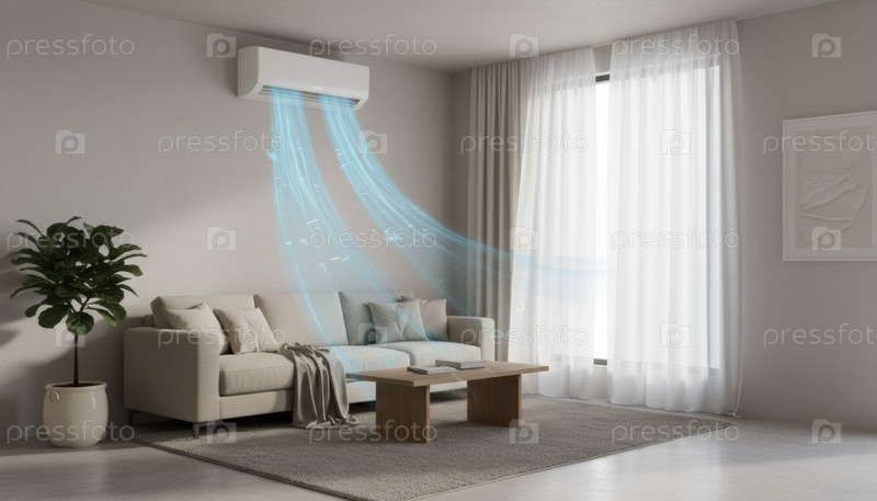 Современная гостиная с кондиционером, распространяющая свежий воздух по пространству, символизирует комфорт, чистую энергию и важность внутреннего контроля климата в повседневной жизни