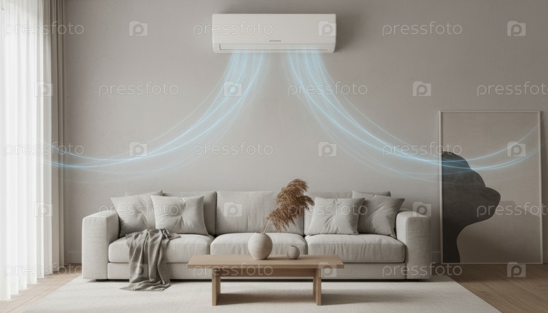 Современная гостиная с кондиционером, охлаждающей воздушные потоки, символизирующая комфорт умного дома, энергоэффективность и минимальный дизайн интерьера для современной жизни