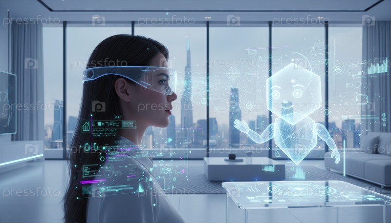 Женщина взаимодействует с голографическим помощником, используя очки дополненной реальности в футуристическом офисе, что символизирует эволюцию цифрового общения и виртуального сотрудничества