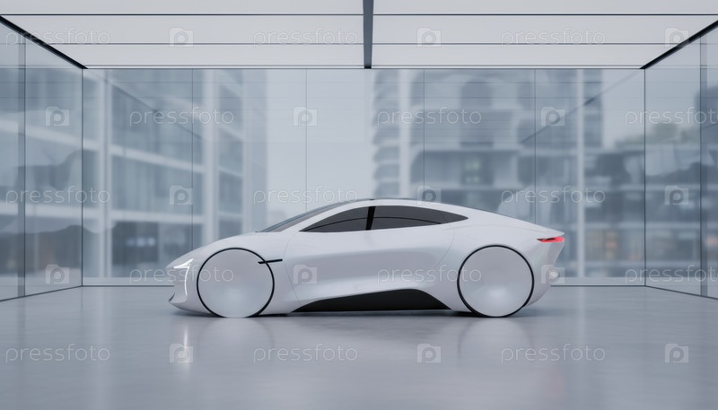 Футуристический белый электромобиль в стеклянном салоне, представляющий инновации в области устойчивой мобильности и видение автономного дизайна в городах будущего