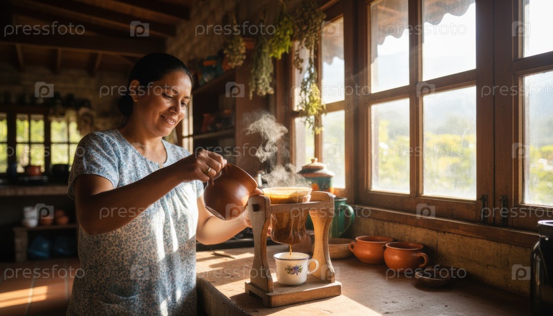 Женщина в уютной деревенской кухне наливает быстро растущий кофе через традиционный фильтр из ткани, что напоминает о тепле, наследии и культурном ритуале медленного жизни и утренней рутины в Латинской Америке