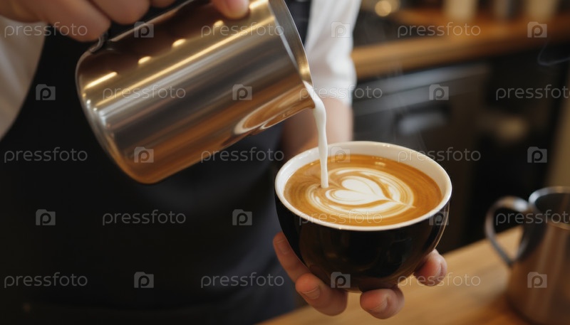 Бариста наливает молоко в чашку для кофе, создавая искусство латте в форме сердца, символизирующее теплое творчество и ритуал утреннего комфорта в уютном городском кафе