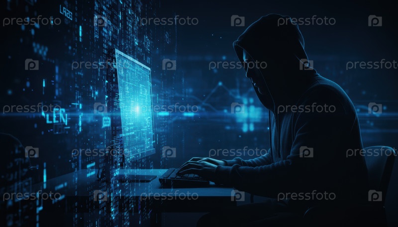 Хакер в темной комнате с капюшоном, работающий на компьютере, окружен светящимся цифровым кодом, символизирующим угрозы кибербезопасности, хакеры и проблемы защиты данных