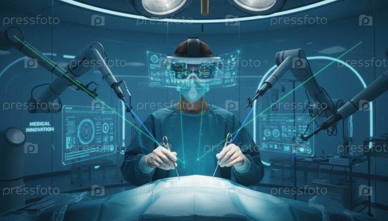 Хирург, работающий с роботизированными руками и дисплеем дополненной реальности в футуристической хирургической комнате символизирует инновации и прогресс в технологиях медицинской робототехники
