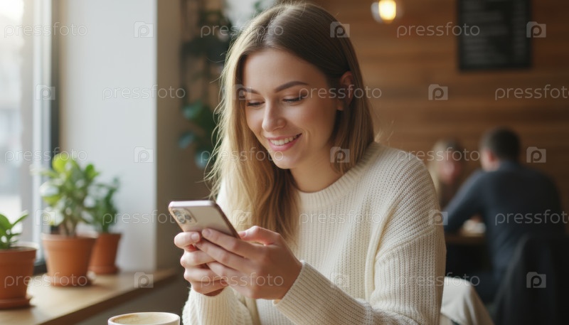 Молодая женщина улыбается, используя свой смартфон в уютном кафе, что представляет собой социальные связи, цифровой образ жизни и повседневные моменты общения и счастья