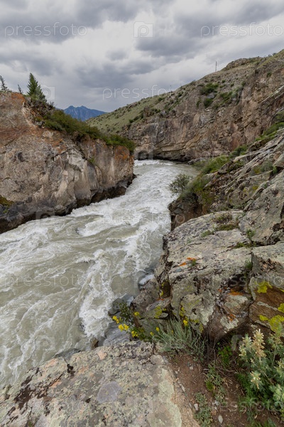 Петреллы на реке Чуя в Алтайских горах Вид на скалистую горную реку в каменистом ущелье в пасмурный летний день Путешествие дикой природы