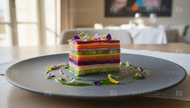 Услойное овощное блюдо в изысканной ресторанной обстановке, символизирующее творчество художественной кухни, тенденцию фермерской кухни, свежесть и современную концепцию питания, подходящее для гурманского мероприятия или кулинарного витрины