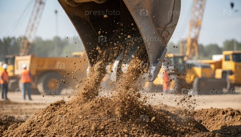 Экскаватор, выпускающий почву, иллюстрирует деятельность на строительной площадке, показывая прогресс проекта землеустройства в солнечных условиях