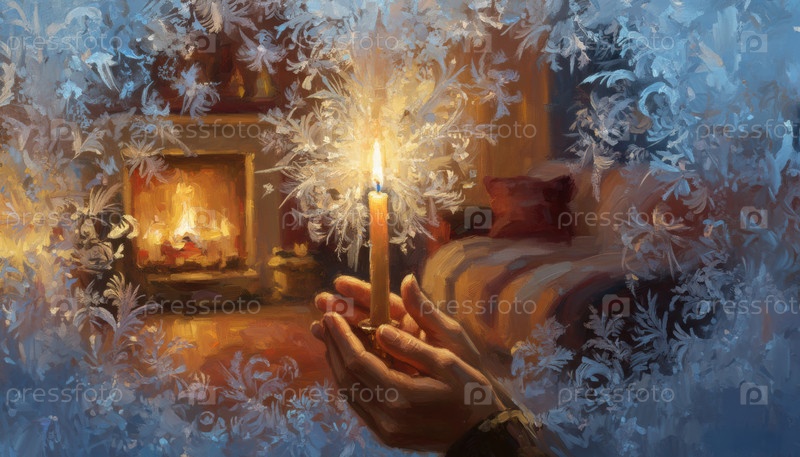 Теплые свечи сияют внутри морозного окна, выражая зимнее настроение и ностальгическую сезонную атмосферу