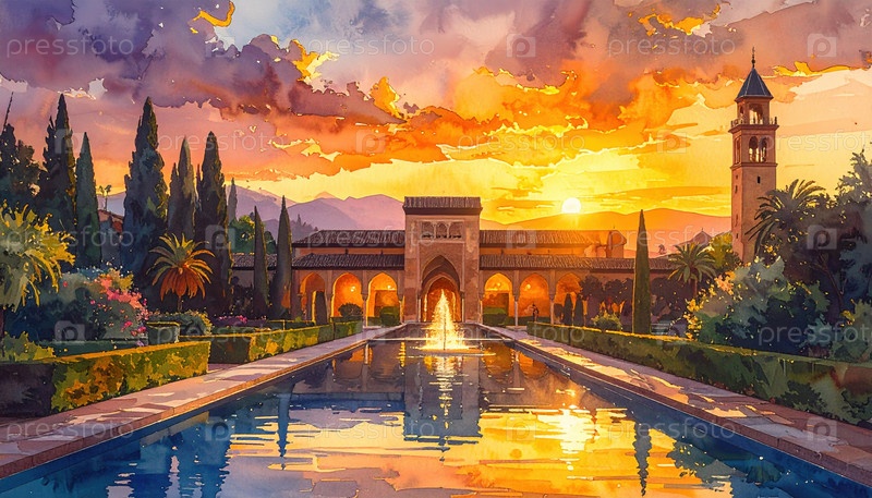 Вид на закат солнца над дворцовыми садами Альгамбры в Гранаде, отражающий испанское архитектурное наследие и культурную красоту под теплым вечерним светом