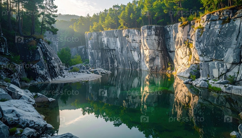 Спокойное озеро карьера отражает высокие каменные скалы, чтобы подчеркнуть мирные пейзажи, сформированные природой