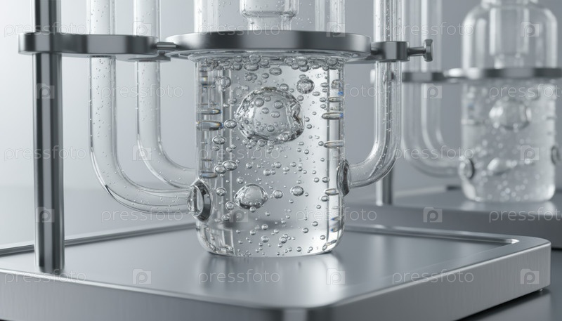 Прозрачный лабораторный реактор с растущими пузырями подчеркивает концепцию современных химических исследований и точных испытаний