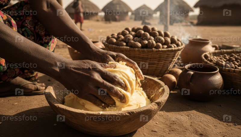 Руки, несущие масло в деревенской обстановке, изображают традиционное ремесло и наследие африканской деревни