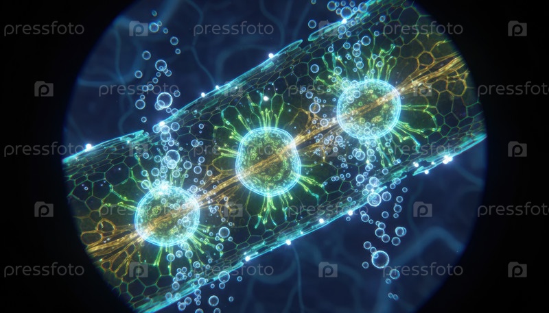 Микроскопические светящиеся клеточные структуры, представляющие инновации биологических исследований и передовые биотехнологические исследования