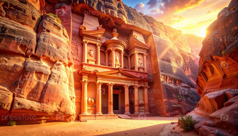 Древний город, высеченный в красной скале, светящийся на солнце, символизирующий вечную цивилизацию, археологию и тайны потерянных империй, сохранившиеся в пустынном камне