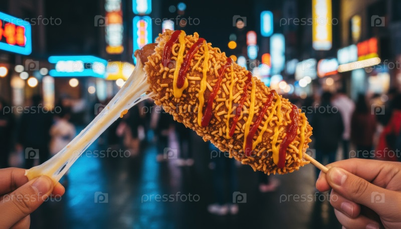 Корейский уличный кукурузный дог с сыром простирается на оживленную ночную сцену рынка, представляя глобальные тенденции уличной кухни и молодые кулинарные приключения в современной городской ночной жизни