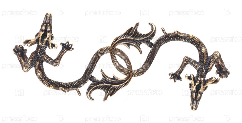 Симетричный декоративный элемент с двумя переплетенными драконами изолирован на белом фоне, резка готова