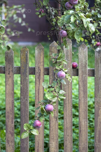 Яблоневые ветви с яблоками возле деревенского забора в летний день