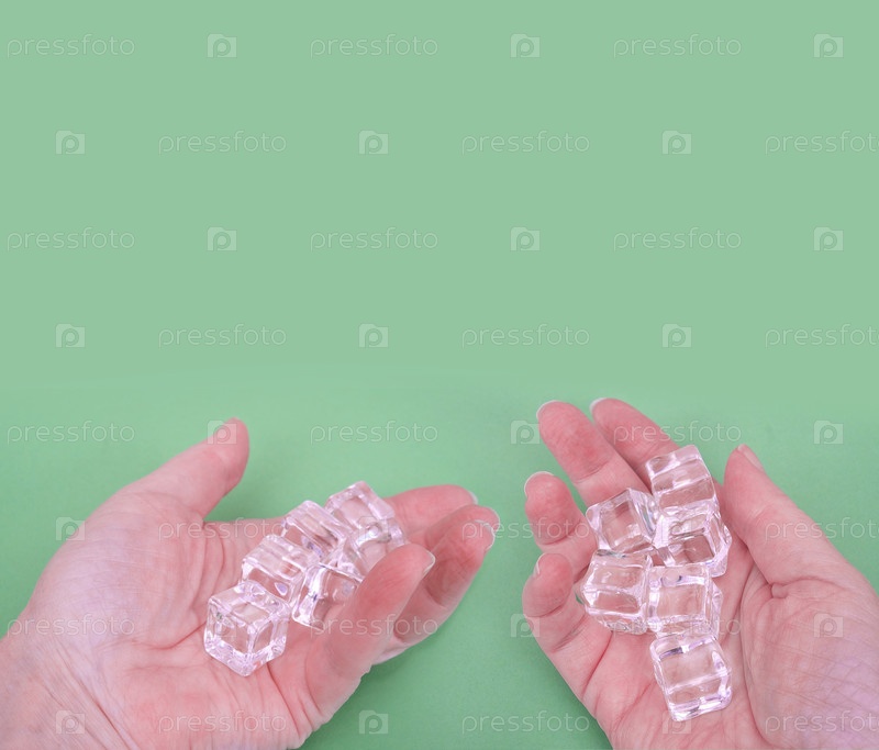 Женские руки с кусками искусственного льда, изолированными на зеленом фоне