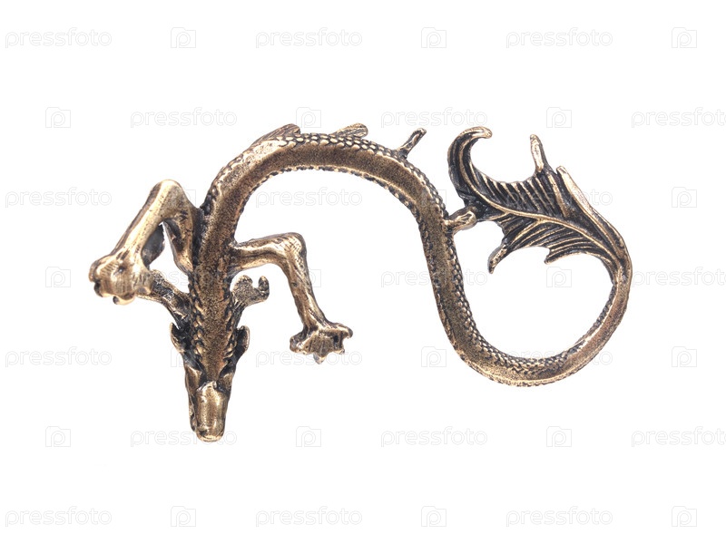 Бронзовая статуя дракона в позе S изолирована на белом фоне, вырезка готова. очень высокое разрешение