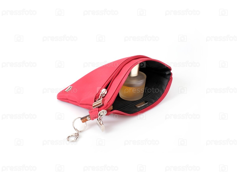 Красная косметическая сумка с бутылкой парфюмерии, изолированной на белом фоне