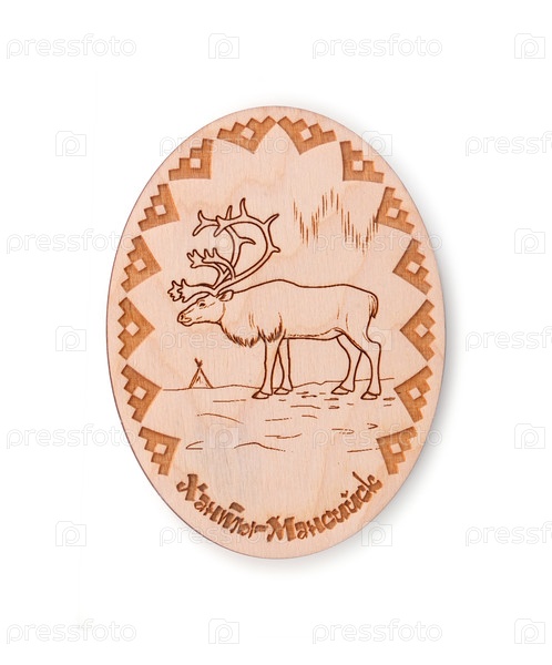 Сувенир (магнит) из России выделен на белом фоне. Надпись означает 'Ханты-Мансийск'