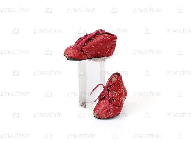 Пара винтажных красных детских сапог с золотым узором на дисплее стоит изолирована на белом фоне, вырезка готова