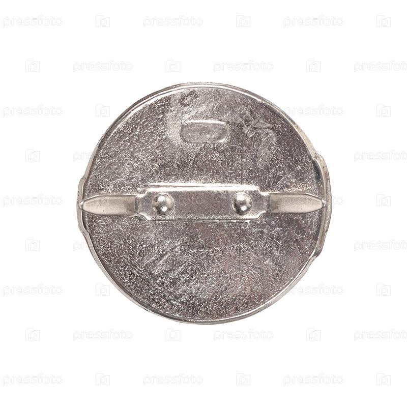 Обратная сторона круглой металлической иконы с прикрепленными булавками, выделенных на белом фоне