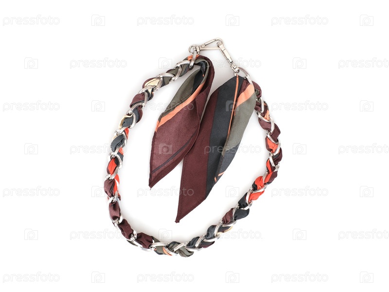 Оригинальная рукоятка сумочки из шелкового шарфа и серебряной цепи изолирована на белом фоне