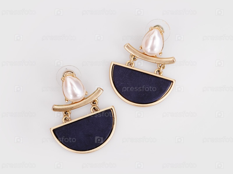Золотая серёжка с синими камнями на белом фоне