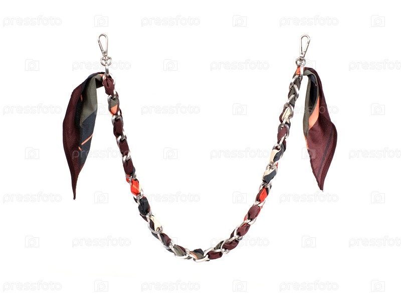 Оригинальная рукоятка сумочки из шелкового шарфа и серебряной цепи изолирована на белом фоне
